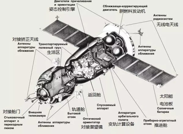 “聯(lián)盟”號(hào)飛船的結(jié)構(gòu)示意圖,原圖中的俄文筆者已將自己認(rèn)識(shí)的部分用中文標(biāo)注在旁邊??梢郧宄乜吹健奥?lián)盟”號(hào)標(biāo)志性的三艙制結(jié)構(gòu)