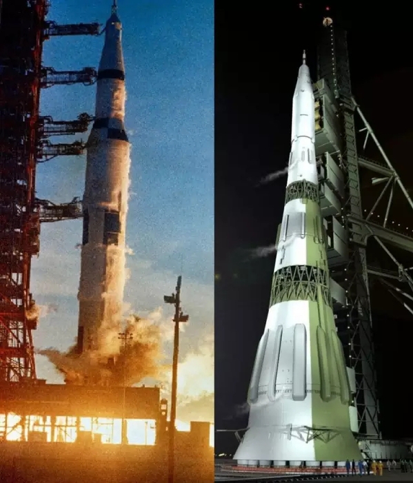 左側(cè)為美國(guó)的“土星5號(hào)”運(yùn)載火箭,近地軌道運(yùn)載能力高達(dá)135噸,相比之下今天大部分重型運(yùn)載火箭都只有20噸左右;右側(cè)就是蘇聯(lián)的N-1火箭,四次發(fā)射四次失敗的她挫敗了蘇聯(lián)人的登月夢(mèng)想;或許就是受她的刺激,蘇聯(lián)后來(lái)在1987年成功試射了“能源”號(hào)運(yùn)載火箭,這是人類(lèi)歷史上唯一一種比“土星5號(hào)”還要強(qiáng)大的火箭——然而“能源”號(hào)還沒(méi)來(lái)得及大顯身手蘇聯(lián)就解體了