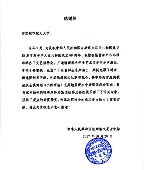 團(tuán)隊(duì)還多次帶領(lǐng)大學(xué)生藝術(shù)團(tuán)踏出國門進(jìn)行文化藝術(shù)交流,先后赴澳大利亞、新西蘭、印尼、菲律賓、斯洛文尼亞、澳門等國家和地區(qū)進(jìn)行表演,弘揚(yáng)中國傳統(tǒng)文化。中國駐澳大使章均賽先生稱贊學(xué)生的表演“非常專業(yè),充滿激情”,中國駐斯大使館專門發(fā)來信函感謝南航師生為中斯友誼做出的貢獻(xiàn)。